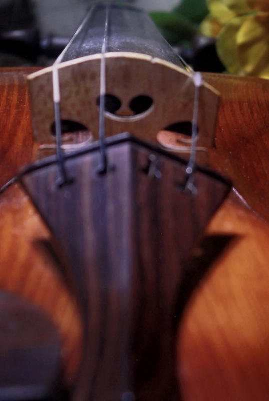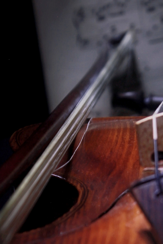 degli strumenti ad arco. Al centro del quadro, un violino è posto in primo piano, la sua forma elegante e