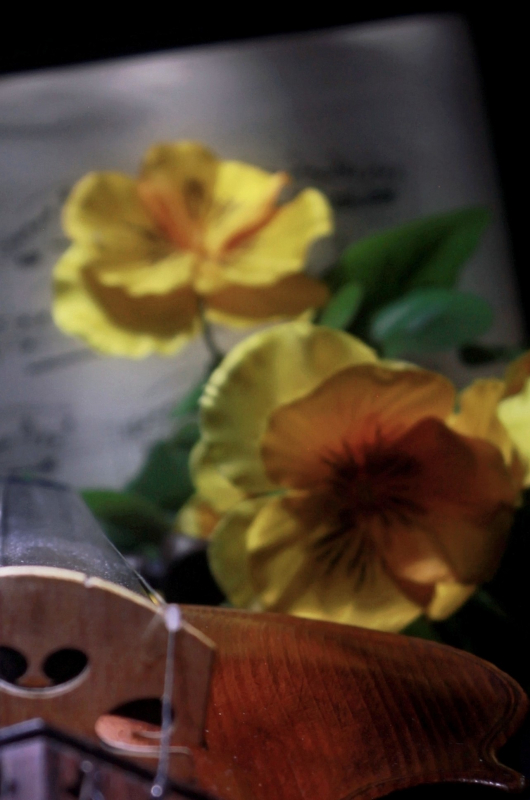 terrosi del violino e dello spartito. I fiori non solo adornano la scena, ma simboleggiano anche la gioia e la