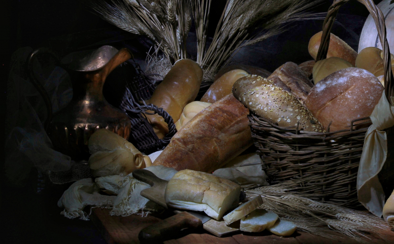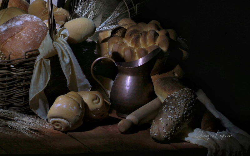 L'immagine intitolata "Festa del Pane" cattura perfettamente l'essenza di un'antica tradizione culinaria, celebrando l'arte della panificazione in tutte le sue sfumature. In primo piano, una varietà di pani di dimensioni e forme differenti si dispone armoniosamente, ciascuno con la propria caratteristica unica, evidenziando la ricchezza e la versatilità di questo alimento fondamentale nella nostra cultura.