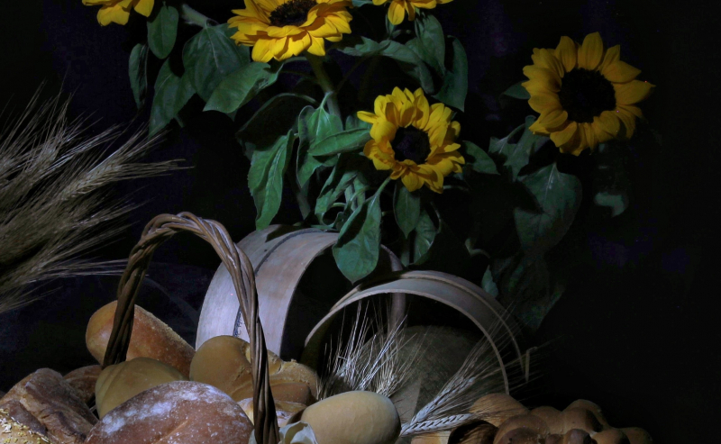 Un elemento simbolico di particolare rilevanza è rappresentato dal mazzo di spighe di grano, che non solo celebra la materia prima essenziale per la panificazione, ma sottolinea anche il legame indissolubile tra la terra e il cibo. Accanto a queste spighe, i girasoli vividi si stagliano con i loro colori caldi e luminosi, rappresentando la vitalità della natura e l'importanza della campagna nella produzione alimentare.