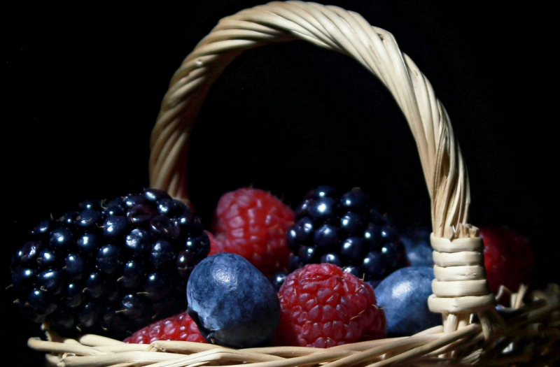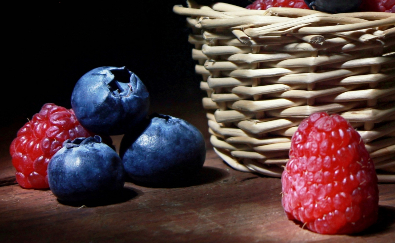 Nell'immagine in oggetto, si osserva una composizione armoniosa di frutti di bosco che giacciono all'interno di un cesto di vimini, sapientemente disposto sul piano di una superficie rustica. I frutti, tra cui mirtilli, lamponi e ribes, si presentano in una varietà di forme e colori che spaziano dal blu intenso al rosso vibrante, riflettendo una freschezza e una vivacità tipiche della stagione estiva.