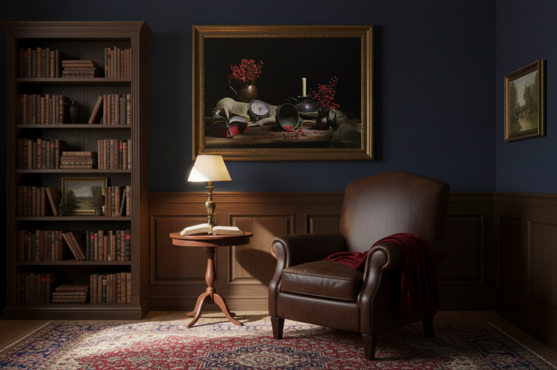 Accanto alla candela, una vecchia sveglia, con le sue lancette immobili, appare come un monito silenzioso: il tempo non aspetta nessuno e il suo ticchettio, ora assente, evoca la sensazione di attesa e di nostalgia. I libri, sparsi attorno all'oggetto principale, rappresentano le esperienze e le conoscenze accumulate nel corso della vita, schegge di saggezza che, sebbene preziose, possono apparire insufficienti al cospetto dell'implacabilità del tempo.